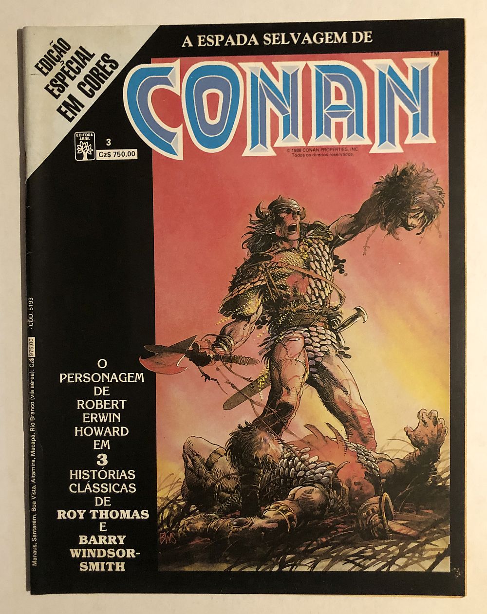CONAN CORES nº 3 – Editora Abril (12/1988), formato magazine (21×27,5cm). Lombada com grampos.